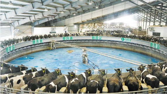 牧场安装了自动投食、智能清扫、隧道式通风、感应式喷淋等设施;运营管理系统和物联网技术结合,全牧场、全天候监控牧场各个环节,并对牛舍的温度、湿度、光照等进行调节,让奶牛的生活更舒适;运用自动挤奶设备及匹配的软件管理系统、发情自动检测装置及相应的繁殖决策支持系统、TMR自动监控装置及相应的管理系统、环境自动感应装置,对奶牛全生命周期进行无微不至的关怀,让在这里“安家”的奶牛过得健康、舒适。
